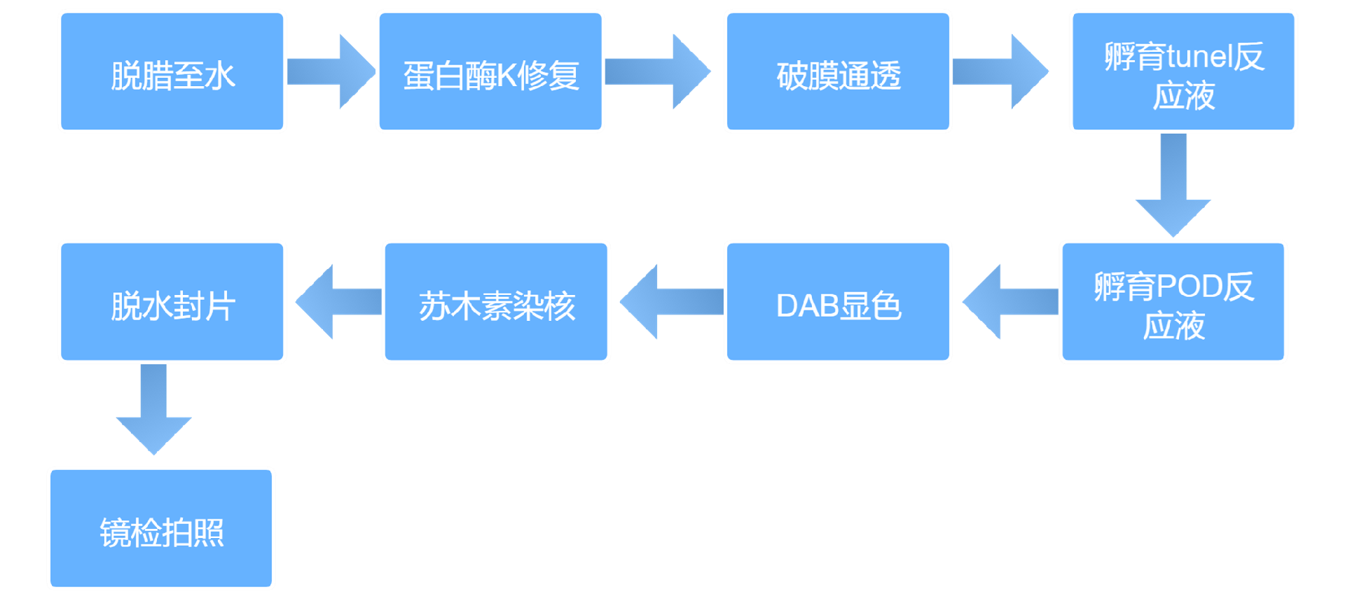 晚期凋亡细胞中染色体DNA双链或单链断裂产生粘性3'-OH末端,在脱氧核糖核苷酸末端转移酶(TdT)的催化下,将带有生物素(Biotin)分子的dUTP,标记到DNA的3'-末端,随后和辣根过氧化物酶(HRP)标记的链酶亲和素Streptavidin(Streptavidin-HRP)结合,最后通过DAB显色来显示凋亡细胞,从而可以通过普通光学显微镜检测到凋亡的细胞,这就是Tunel(TdT-mediateddUTPNick-EndLabeling)法检测细胞凋亡的原理。