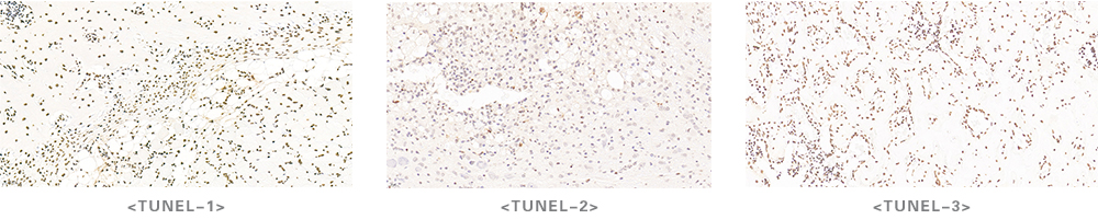 Tunel染色即原位末端转移酶标记技术。凋亡细胞的DNA双链断裂或一条链出现缺口,产生一系列3’-OH末端,在脱氧核糖核苷酸末端转移酶(TdT)作用下,将脱氧核糖核苷酸和生物素所形成的衍生物标记到DNA的3′末端,从而进行凋亡细胞的检测。TUNLE染色是分子生物学与形态学相结合的研究方法,对完整的单个凋亡细胞核或凋亡小体进行原位染色,能准确的反应细胞凋亡最典型的生物化学和形态特征。